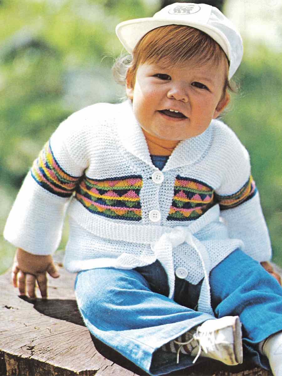 Sød jakke i Piggelen garn med flerfarvet strikket bærestykke. Strik nedefra og op i glatstrik med diagrammer på bærestykket. Ærmer og forstykker samles efter blokning. Afsluttet med knapkant og halsudskæring i glatstrikning.