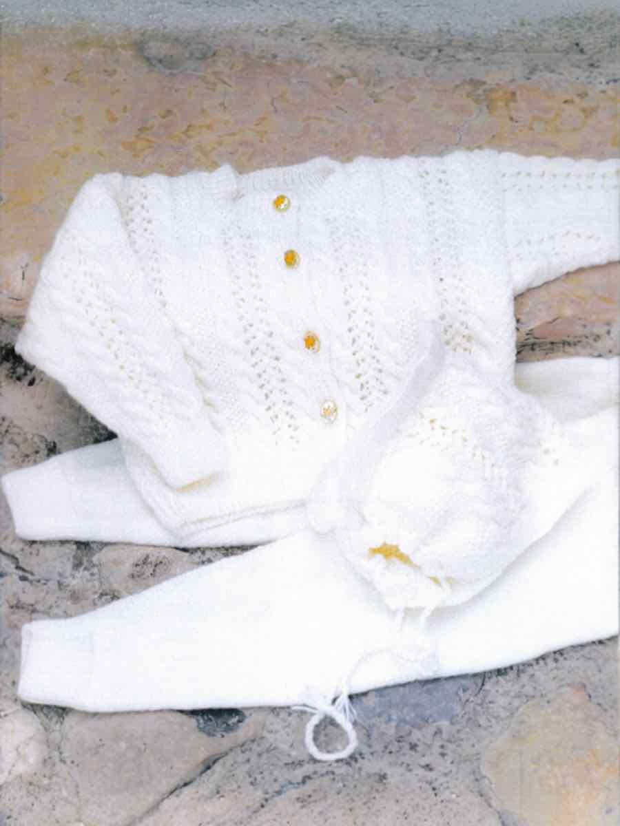Strikket sweater med fletning og hulmønster, ribkant i hals og ærmer. Bukserne strikkes ovenfra med rib og ben i glatstrik. Huen hækles i stangmasker og afsluttes med snore.