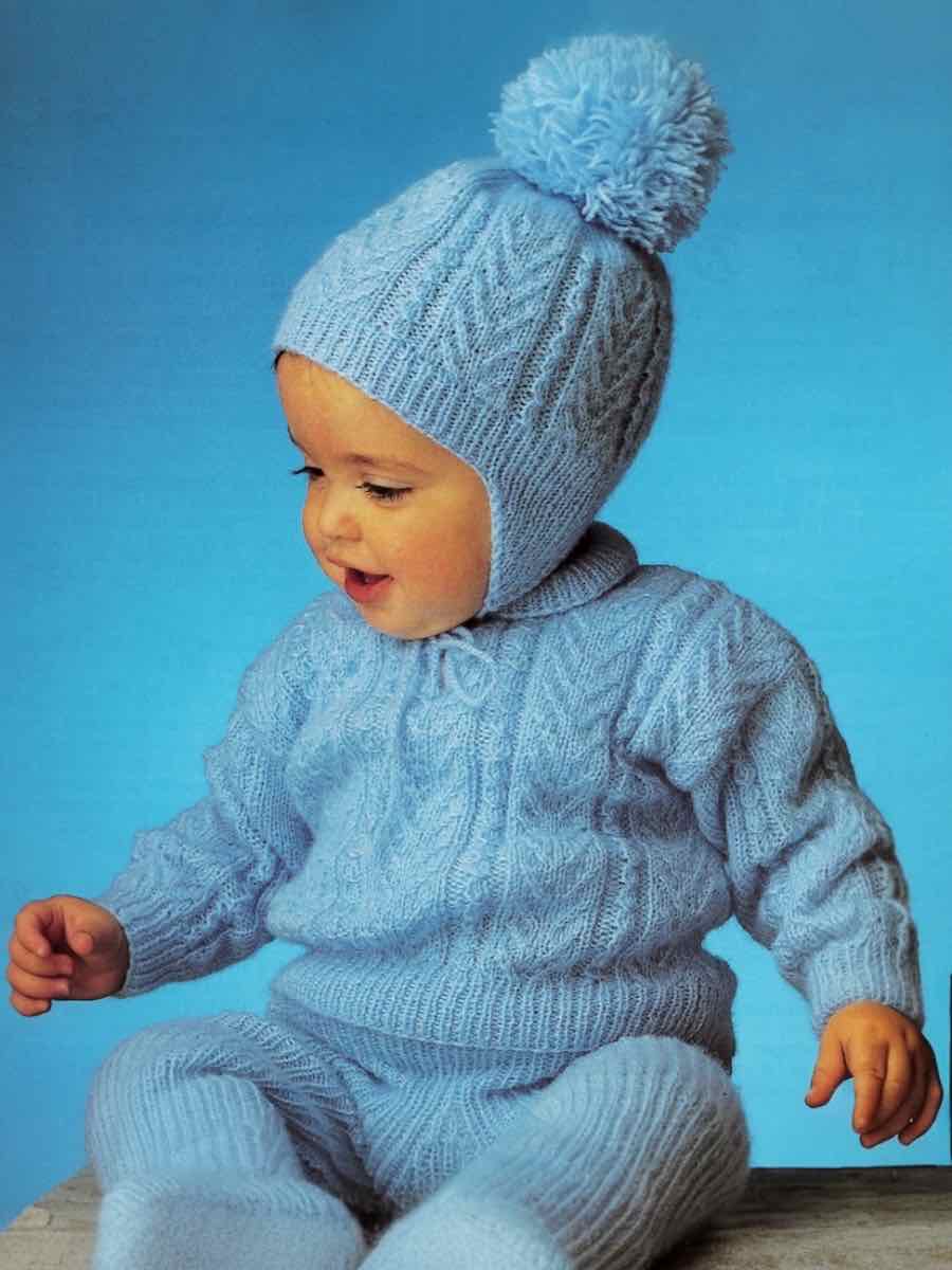 Sæt til baby: sweater, bukser, hue og sokker i elastik og glatstrik. Alle dele strikkes nedefra og op. Sweateren har en knap i halsen. Øreklapper og elastik strikkes direkte på huen. Bukserne har snøre og elastik. Montering med let blokering.