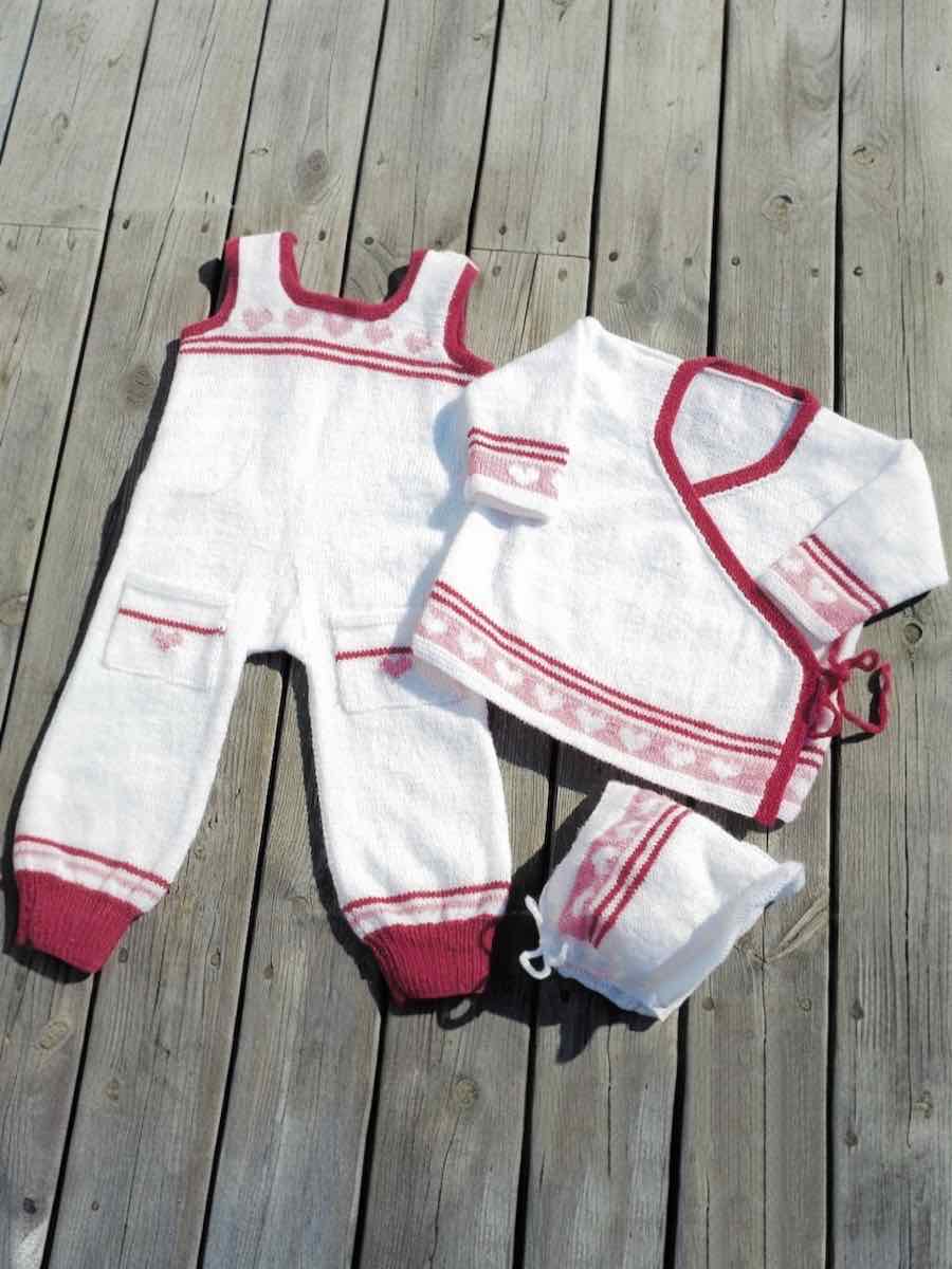 Sødt babysæt med hjertemotiv i Piggelengarn. Cardigan, bukser, hue og hætte er strikket i dele og samlet. Diagrammet med hjerter er strikket efter mønster. Tøjet har fine detaljer såsom knapper, kantmasker og snore.