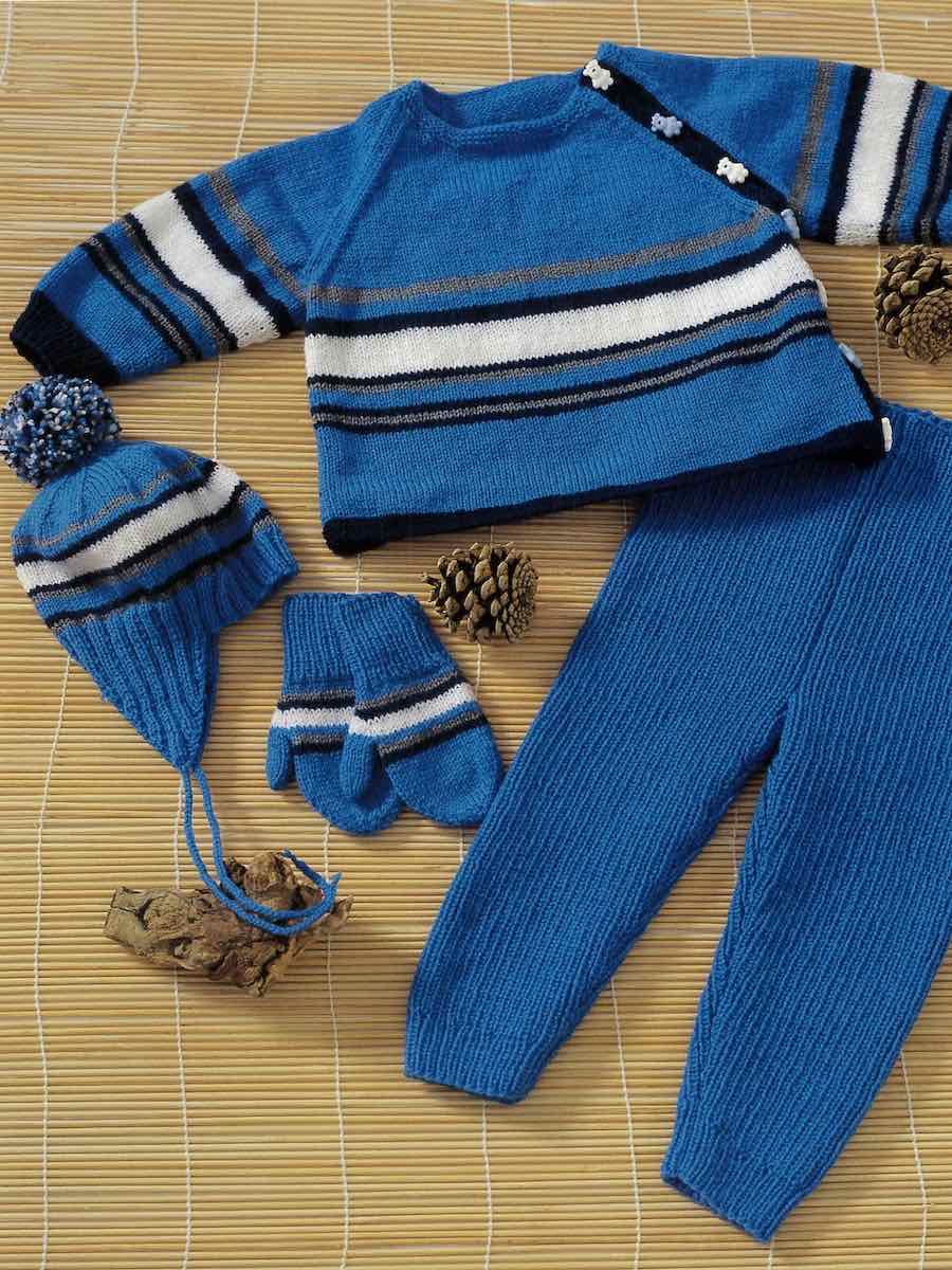 Fint tofarvet babysæt med sweater, bukser, hue og vanter i Piggelen-garn. Tøjet er strikket i dele med raglanindtagninger og sat sammen. Detaljer som snore og øreklapper er hæklet.