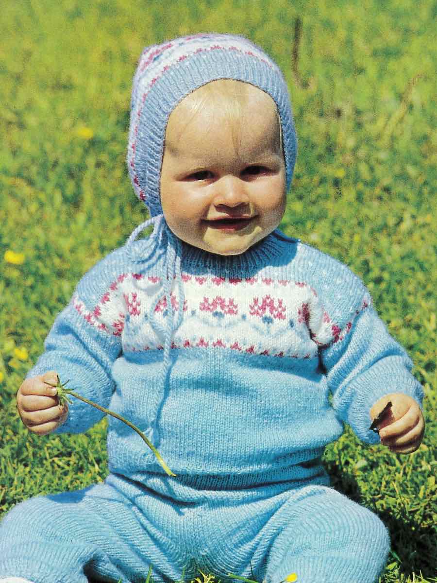 Babysæt strikket på traditionel vis med mønstret kant. Alt strikkes nedefra og op.