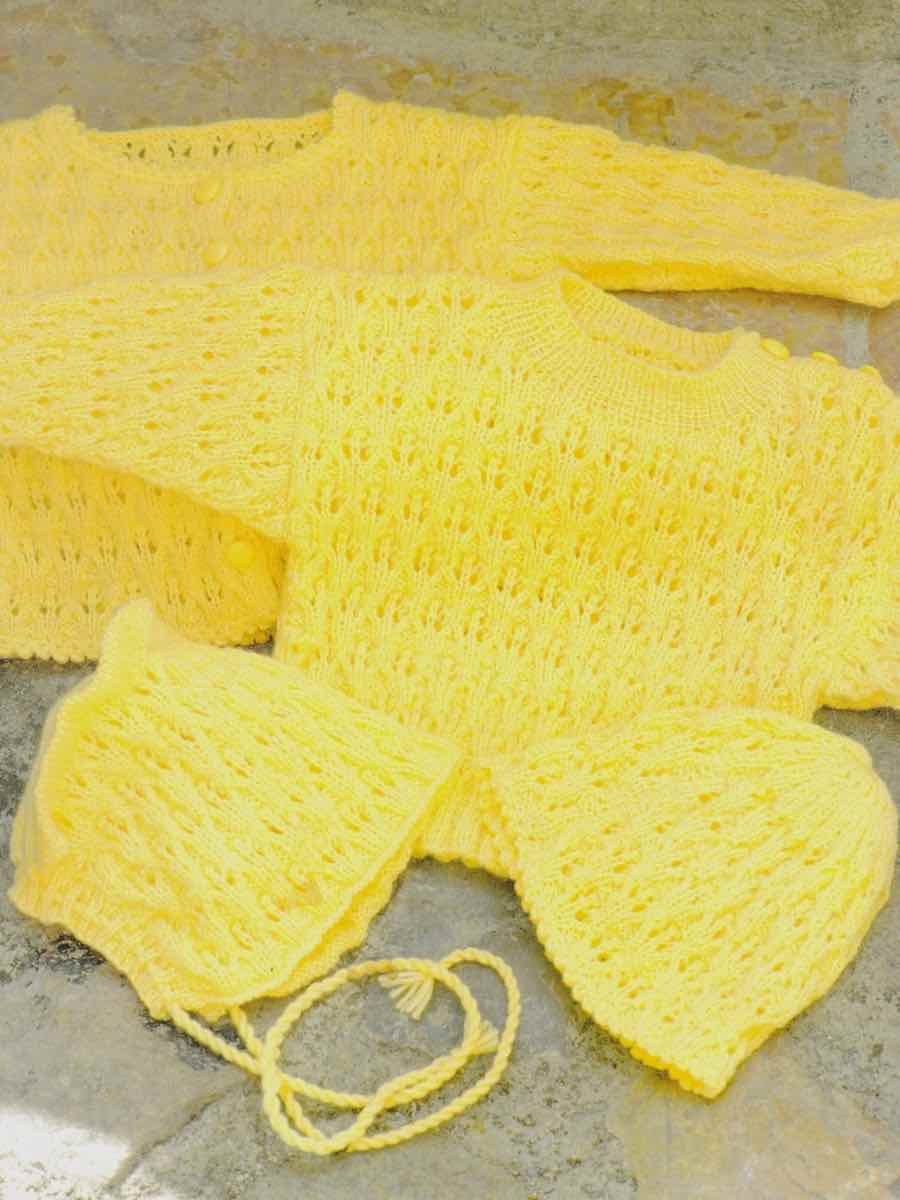 Sæt med sweater, hue og vanter med vingehat – alle med et fint hulmønster. Sweateren strikkes nedefra og op med diagrammer, ærmerne strikkes separat. Huen strikkes rundt fra rib og op. Vanterne strikkes i ét stykke med tommelfingerkile, efter diagrammerne.