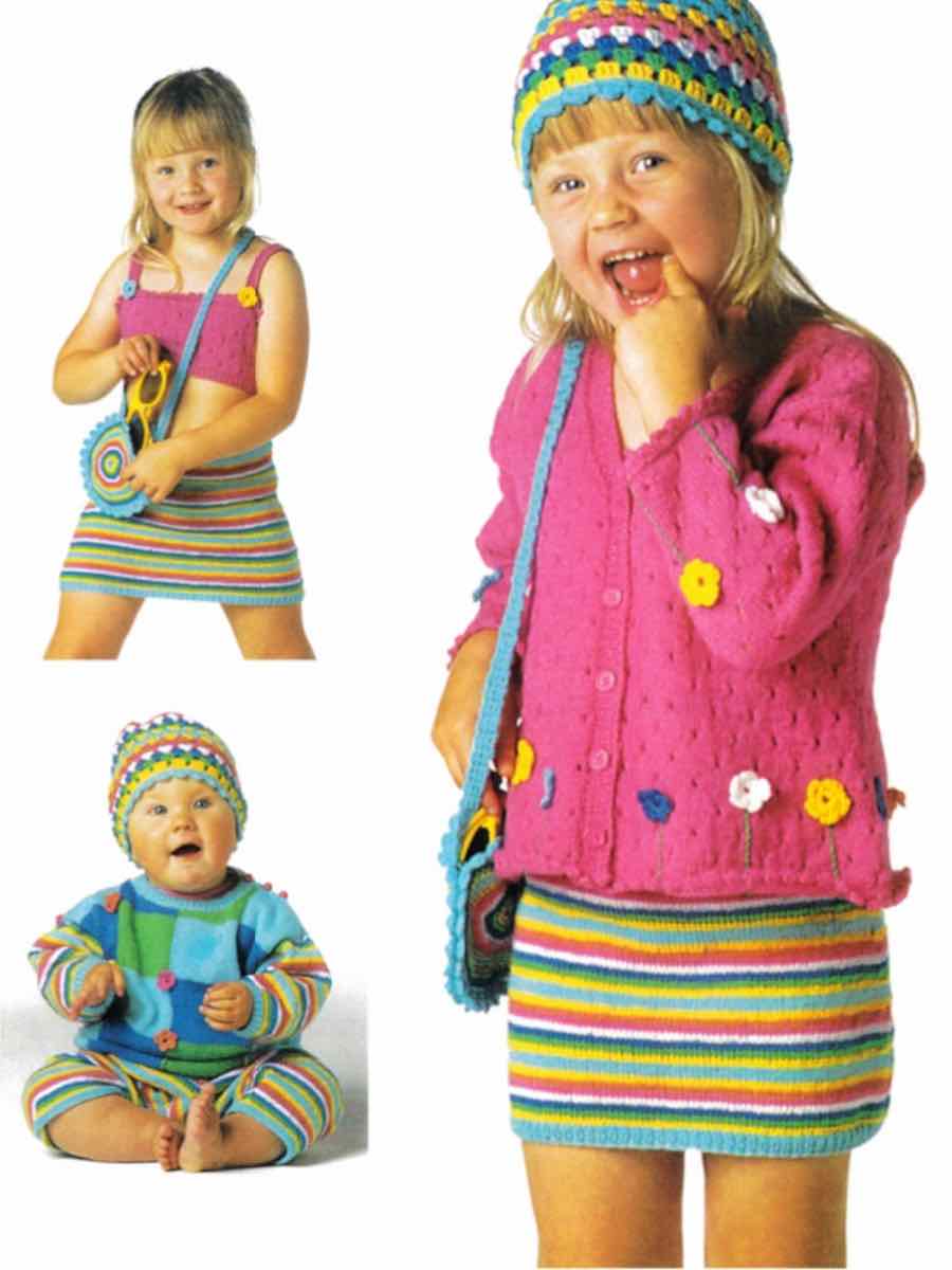 Sweater , cardigan og nederdel strikkes i glatstrik med rib og enkle indtagninger, mens huer og tilbehør hækles rundt med lm, stangmasker og dobbeltmasker. Farveskift og små detaljer bringer liv.