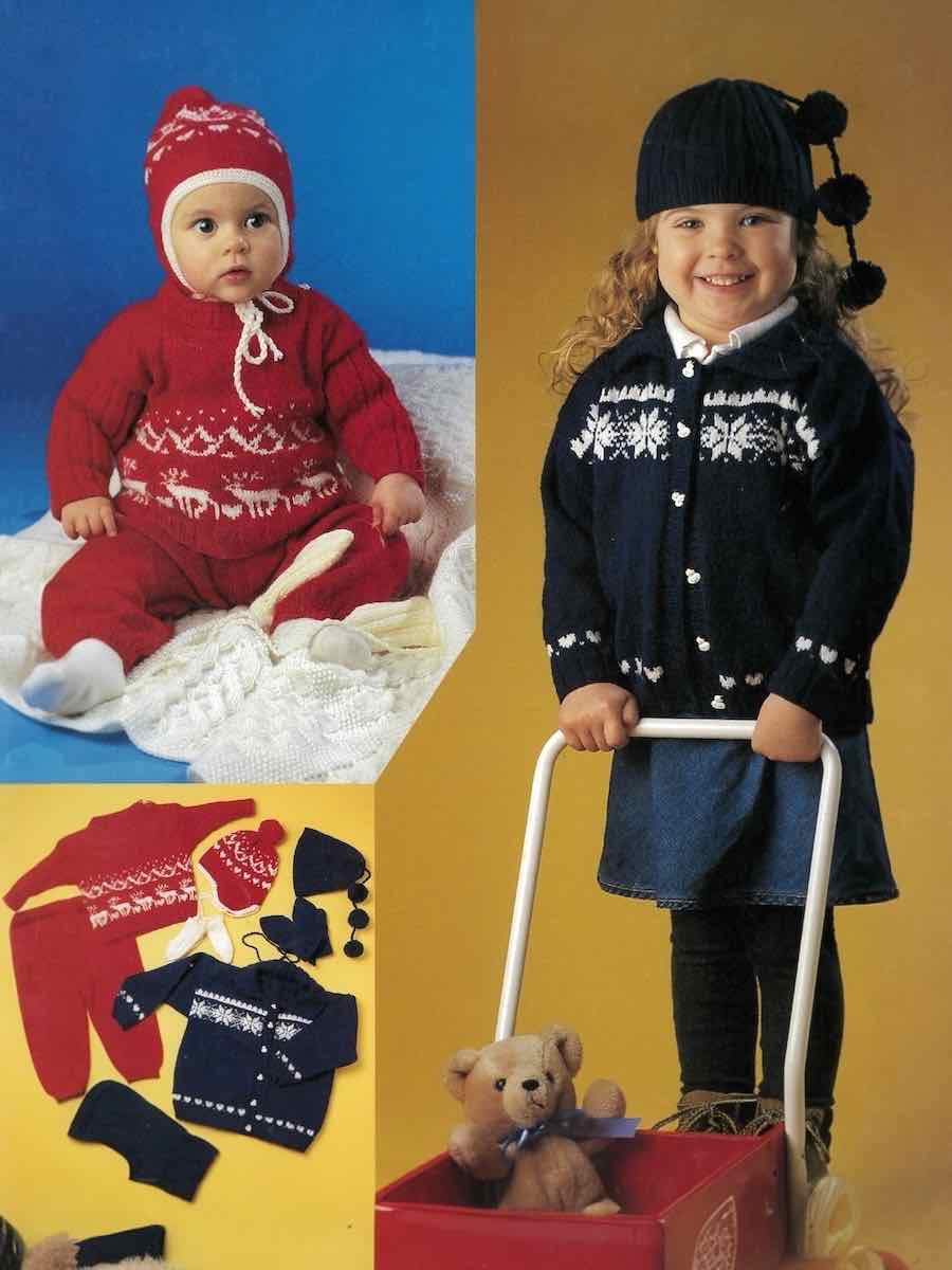 Sweater, hue, cardigan, ensfarvede vanter, bukser, væbnerhuer og sokker. Alt tøj strikkes nedefra og op, ofte med diagrammer og kantmasker. Vanter og hue hækles og formes i dele.