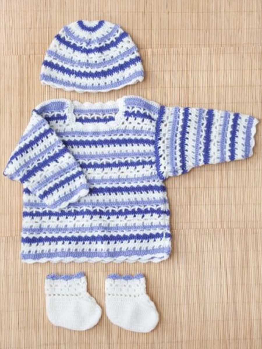 Lav et sødt sæt til de små med denne hækleopskrift til en sweater , hue og sokker . Tøjet er hæklet i det bløde akrylgarn Piggelen. Opskriften indeholder flere forskellige teknikker, herunder stangmasker, halvstangmasker og luftmaskemelumre, der skaber smukke strukturmønstre. Sweateren har en praktisk lukning med seks knapper. Sættet fås i størrelser fra 3 til 18 måneder. Ved at kombinere tre forskellige farver får tøjet et livligt og legende look, der er perfekt til babyens garderobe.