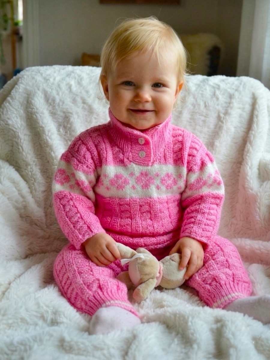 Dette klassiske sæt består af en sweater med mønstret kant og matchende bukser . Mønsteret kombinerer en dekorativ struktur med en smuk blomstermønstret kant i tre farver. Sweateren har en praktisk krave og knaplukning foran, mens bukserne er designet til god bevægelighed med en strikket kile.