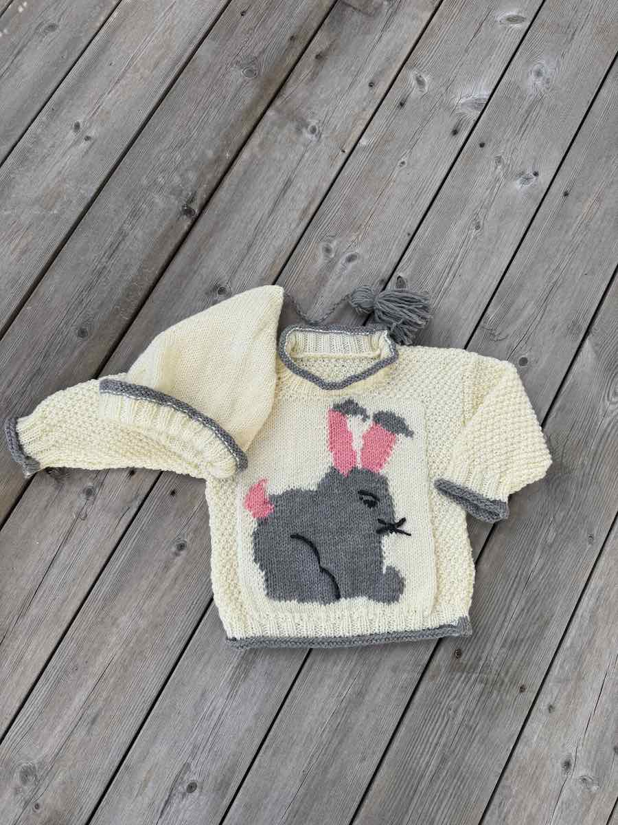 Sweater og hue strikkes i rib, glatstrik og dobbelt retstrik. Sweateren strikkes i dele og sys sammen med en dekorativ kant, der rulles udad. Huen strikkes rundt og afsluttes med en kvast.