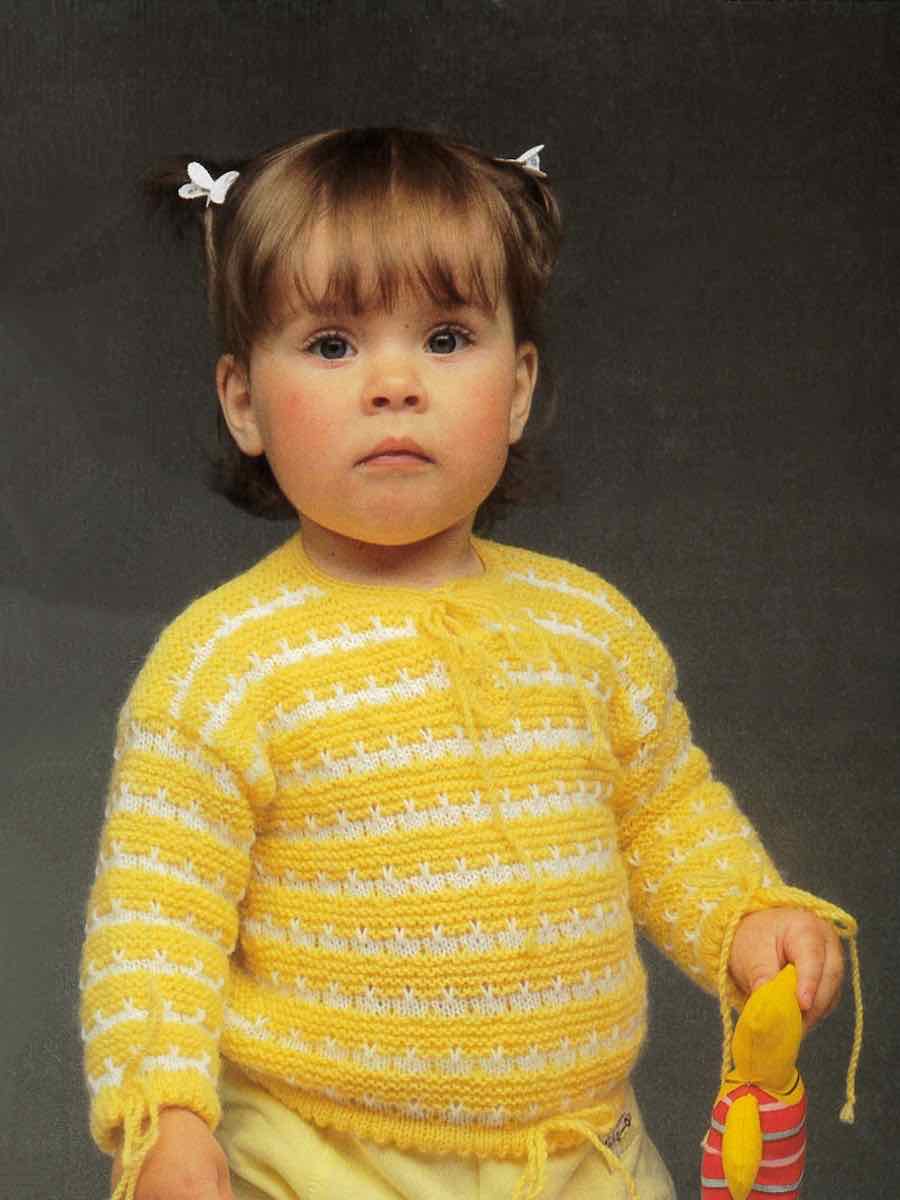 En sød børnetrøje i Piggelen garn med et dekorativt strukturmønster. Trøjen strikkes i dele: rygstykke, forstykke og ærmer. Mønsteret er dannet med ret- og vrangmasker, og tøjet er samlet med elastiske kanter og en rund halsudskæring.