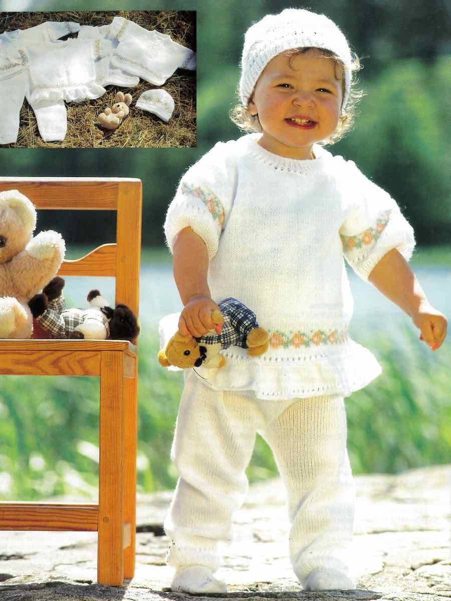 T-shirt, strømpebukser, flæsetrøje, cardigan, hue og vest. Alle beklædningsgenstande strikkes nedefra og op med varierende ud- og indtagninger. Diagrammer bruges til mønsterstrikning.