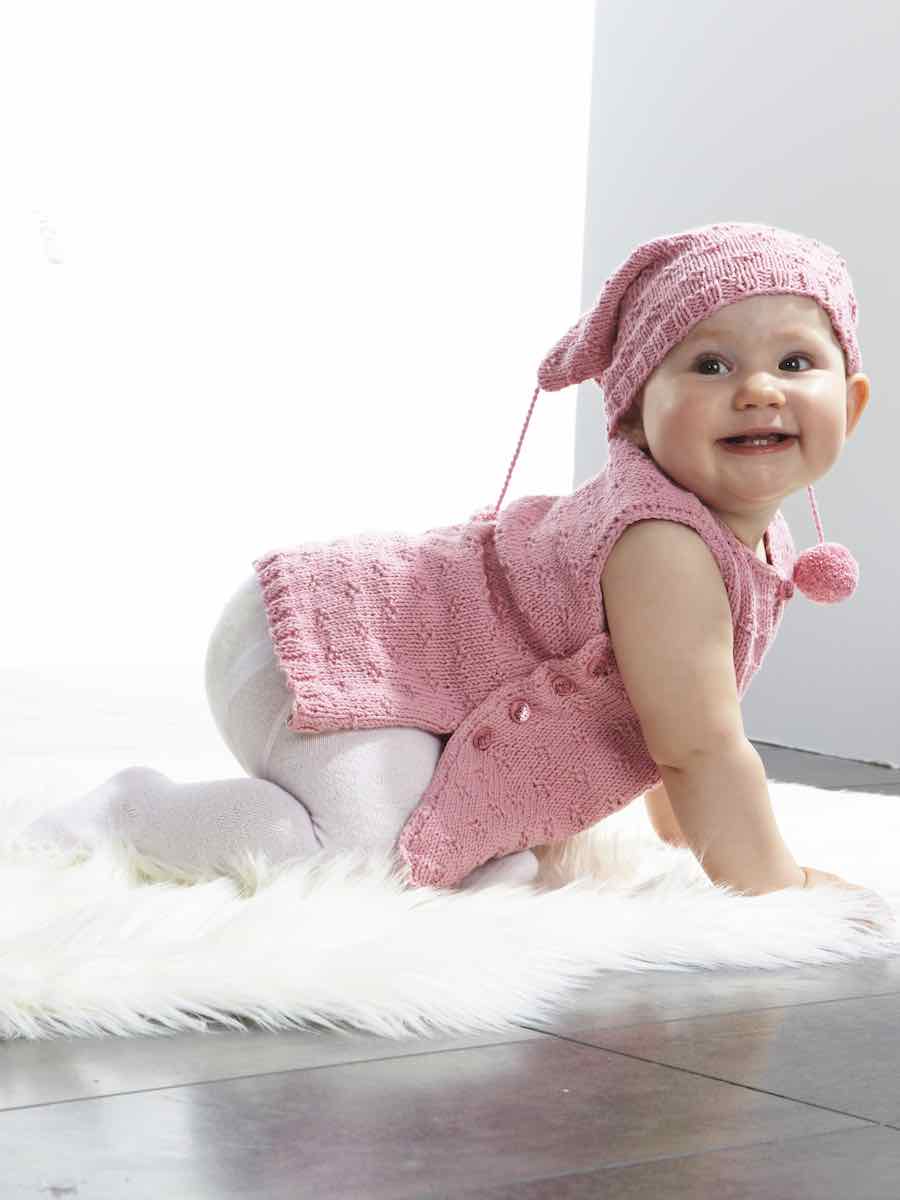 Strik en forklædekjole i bomuldsgarn med elastik og mønster efter diagrammet. Delene formes med indtagninger og knaphuller. Huen strikkes i samme mønster og sys sammen med nøgle- og snordetaljer. Afslut med hæklet kant og knapper.