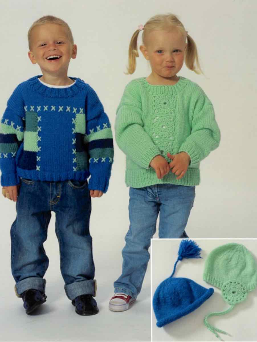 Trøjen er strikket med dobbelt garn i glatstrik og rib, med detaljer som firkanter, krydser og en hæklet kant. Trøjen og huen er formet med enkle udtagninger, indtagninger og samlet med knapper og sømme .