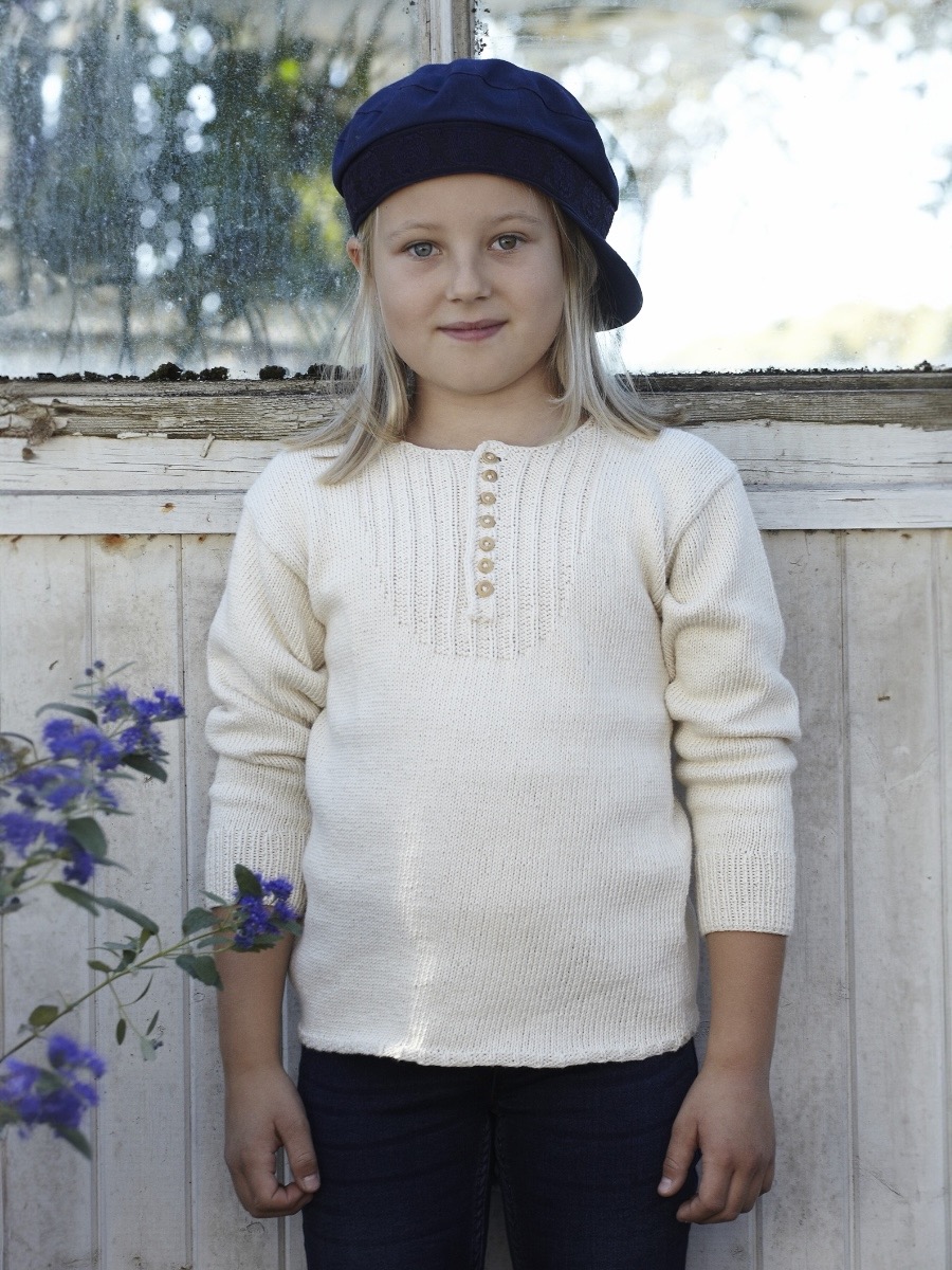 Skab en tidløs og blød strikket børnetrøje . Trøjen har et stilfuldt, gammeldags design med praktiske knapper, der gør den nem at tage af og på.