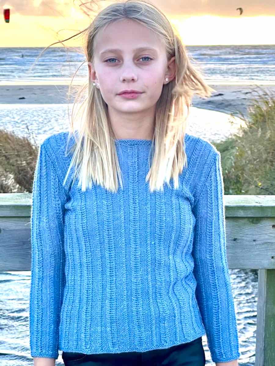 Børnetrøje strikket nedefra og op på rundpinde. Sweaterens mønster er små fletninger, der er meget effektive. Sweateren har et indsyet ærme.