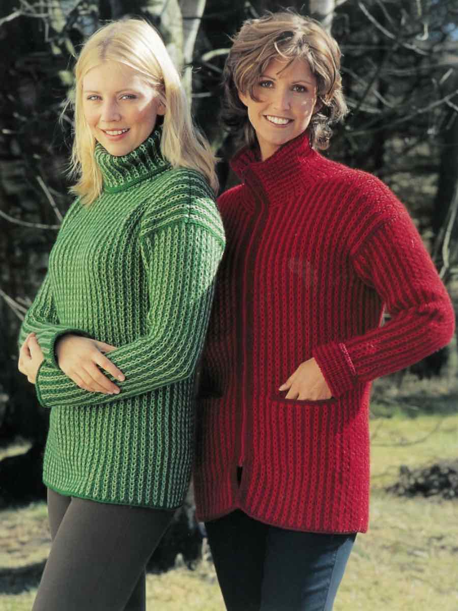 Cardigan og pullover strikket i glatstrik med ud- og indtagninger til facontagning, kantmasker og elastik. Cardiganen har lynlås, pulloveren er nem at samle.