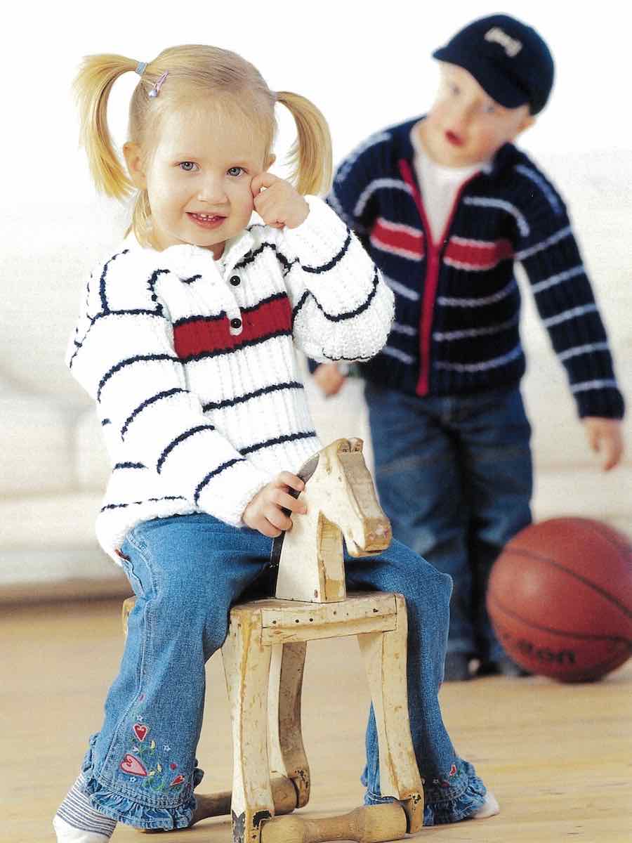 Sweater og cardigan strikket på traditionel vis i dele. Mønsteret fås med slids, knapper eller lynlås.