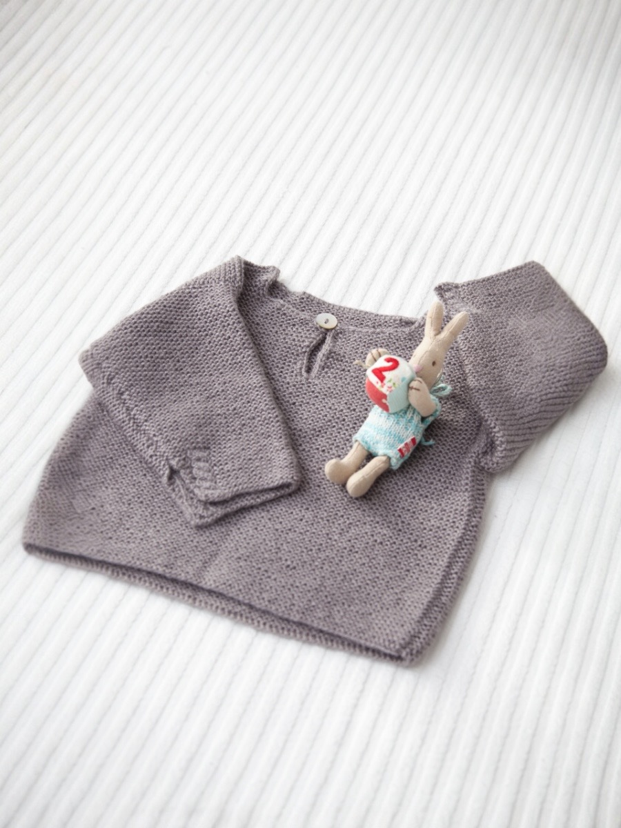 Klassisk børnetrøje i retstrik. Designet har en praktisk knapåbning i halsen, hvilket gør tøjet både funktionelt og tidløst.