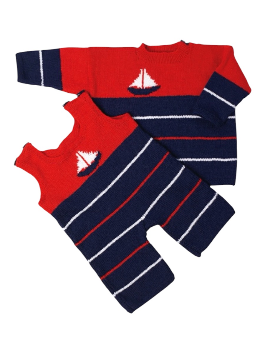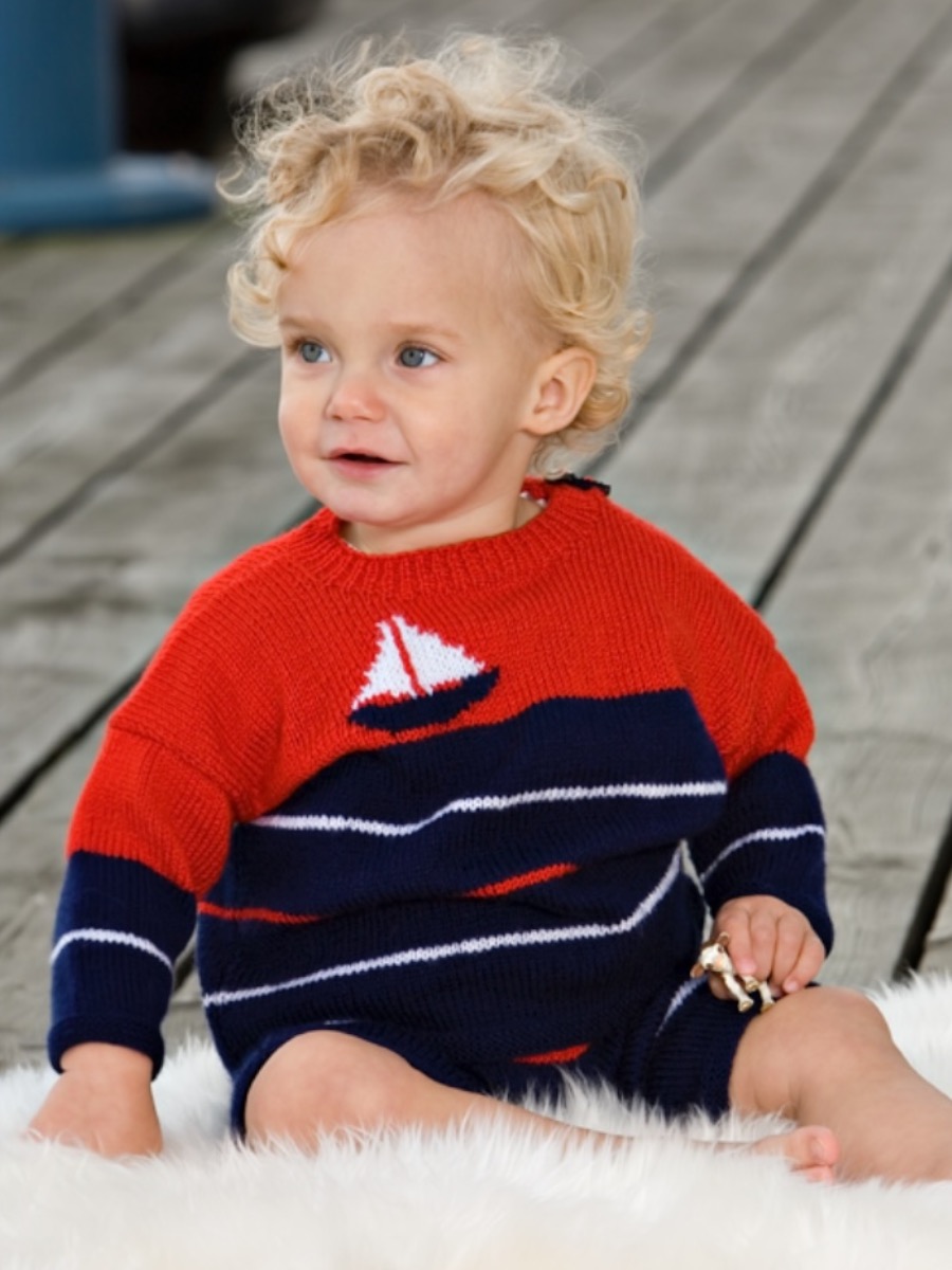 Klassisk sømandssæt . Trøjen starter bagpå med en retstrikningskant i rød, efterfulgt af en marineblå og hvidstribet glatstrikning. Forstykket strikkes på samme måde, men med en dybere halsudskæring. Ærmerne strikkes separat med striber og sys derefter på. Bukserne strikkes i to dele, startende nederst ved benene. En skridtkile laves ved at tage ud og ind for en god pasform. Til sidst samles delene, og kanterne samles rundt om hals og ærmegab for en flot afslutning.