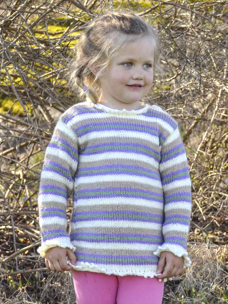 Rundstrikk trøje i glatstrik med striber, delt ved ærmegabene og formet med indtagninger. Forstykke, ryg og ærmer sys sammen. Hals- og ærmekanter strikkes separat og afsluttes med knapper.