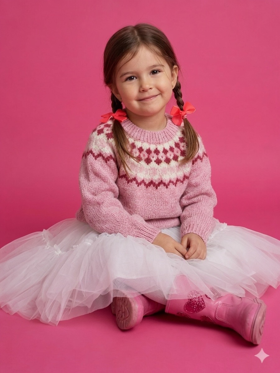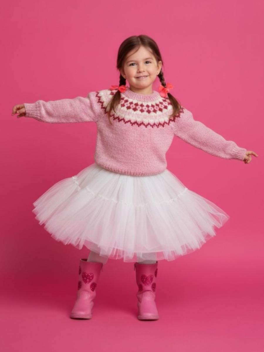 Trøjen strikkes med ærmer og ryg- og forstykke separat i glatstrik op til ærmegabene. Derefter samles alle dele på en rundpind for at begynde bærestykket, som dannes ved at strikke frem og tilbage i omvendte pinde, så bagstykket bliver højere end forstykket. Under arbejdet tages der ind til ærmegabene, samtidig med at mønsteret strikkes rundt efter diagrammet med de forskellige farver. Til sidst strikkes en ribkant ved halsen, som foldes dobbelt og sys fast på indersiden, inden tøjet samles og blokeres.