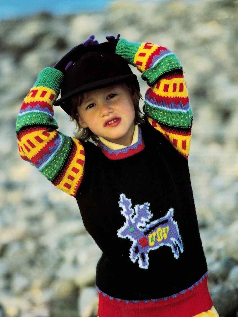 Charmerende børnetrøje med rensdyrmotiv fra Piggelengarn. Strik i dele: for- og bagstykke samt ærmer. Følg diagrammet nøje og strik forskellige farver separat. Luk af ved hals og skuldre, sy sammen og afslut med en elastisk kant og halsudskæring.