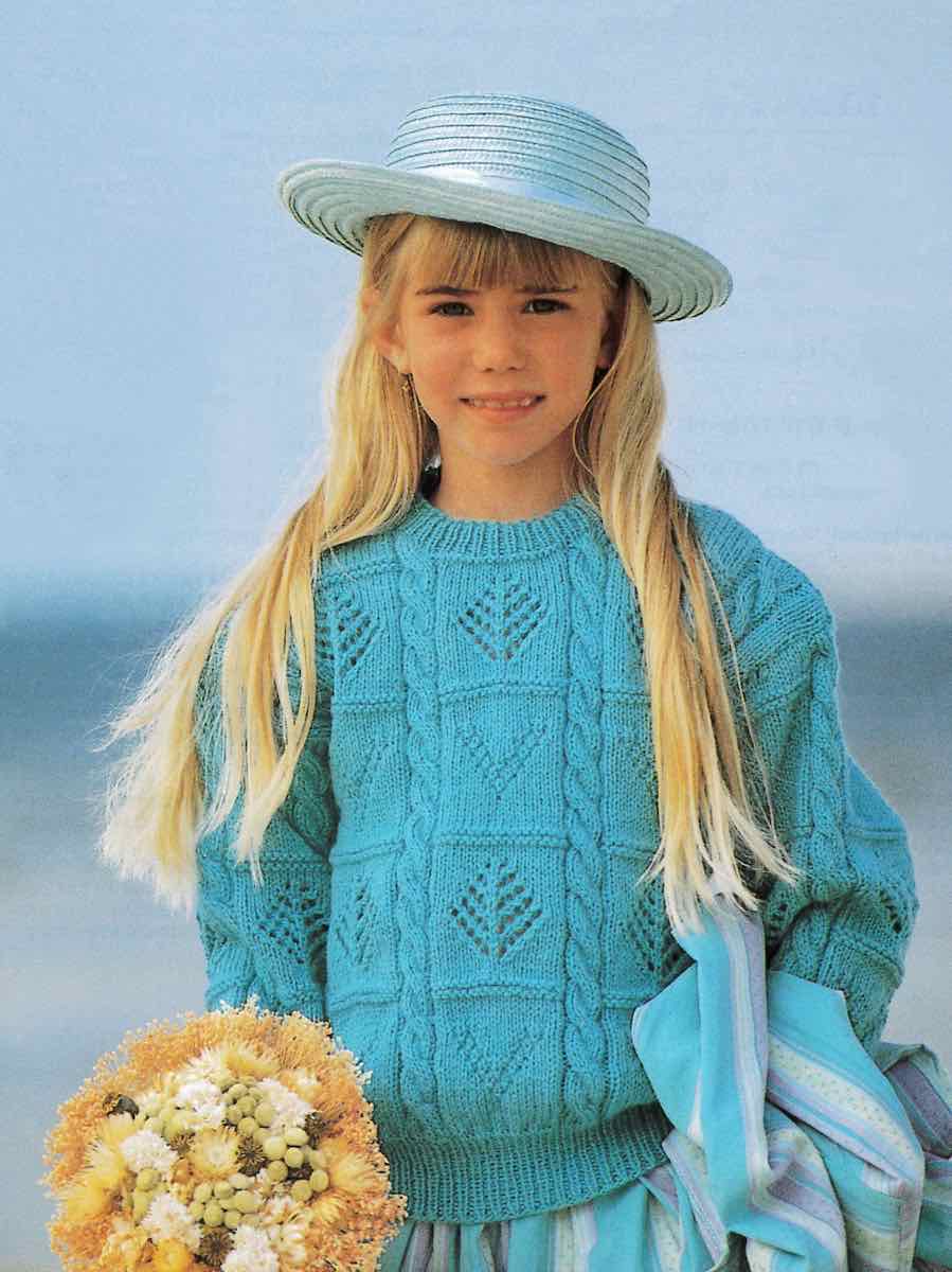 Sweateren er strikket på traditionel vis i dele. Den er strikket med fletninger og mønstre.