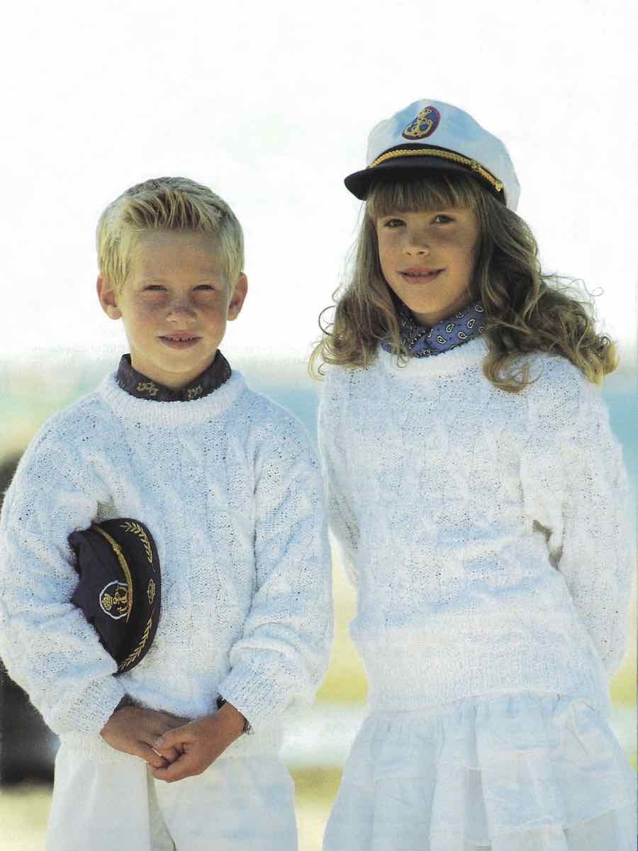 Børnetrøjer strikket på traditionel vis i dele, der er syet sammen. Mønstre med fletninger skaber en flot tekstur.