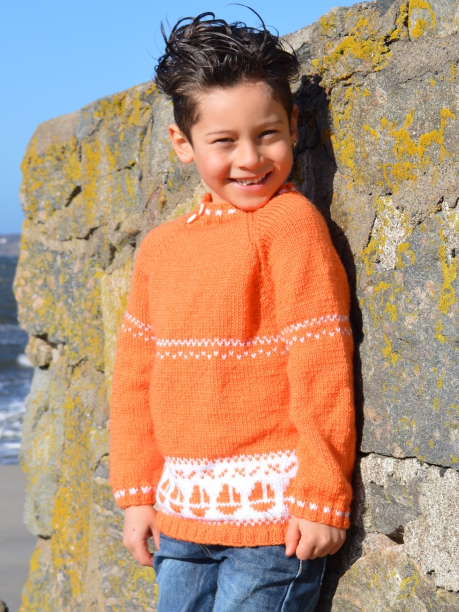 Strik en klassisk sweater med sejlbåde . Sweateren er prydet med et dekorativt sejlbådsmotiv, der minder om hav og sommerbrise, og er strikket i en livlig orange nuance med hvide kontraster, men farvevalget kan selvfølgelig tilpasses din egen smag. Med praktiske knapper i halsen er den også nem at tage af og på.