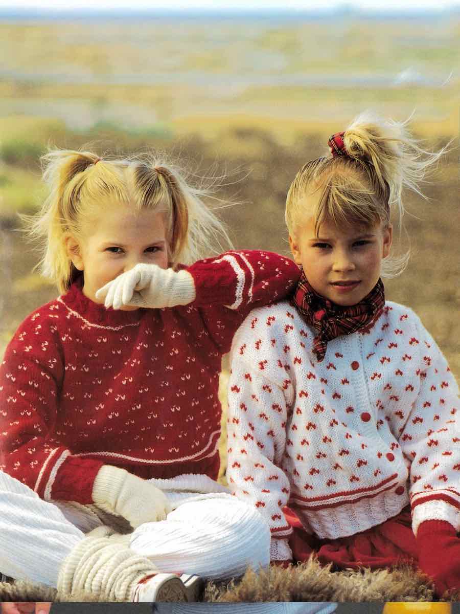 Børnetrøjer og cardigans strikkes traditionelt i fire dele, der er syet sammen. Kanterne på rejsetasken er strikket med fletninger.