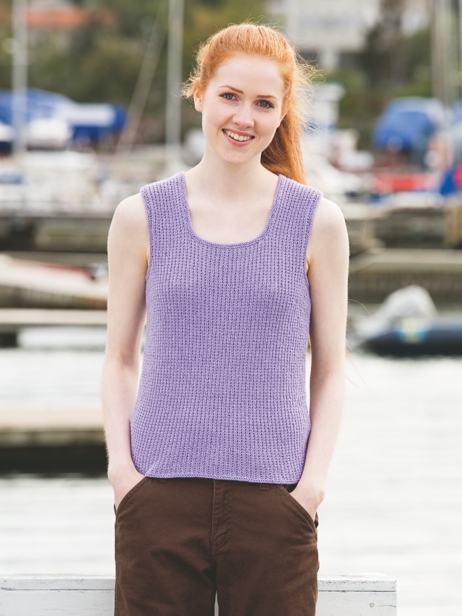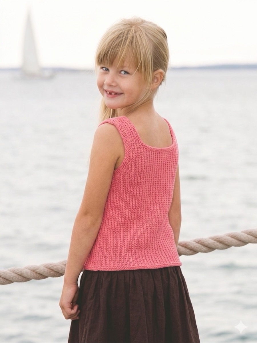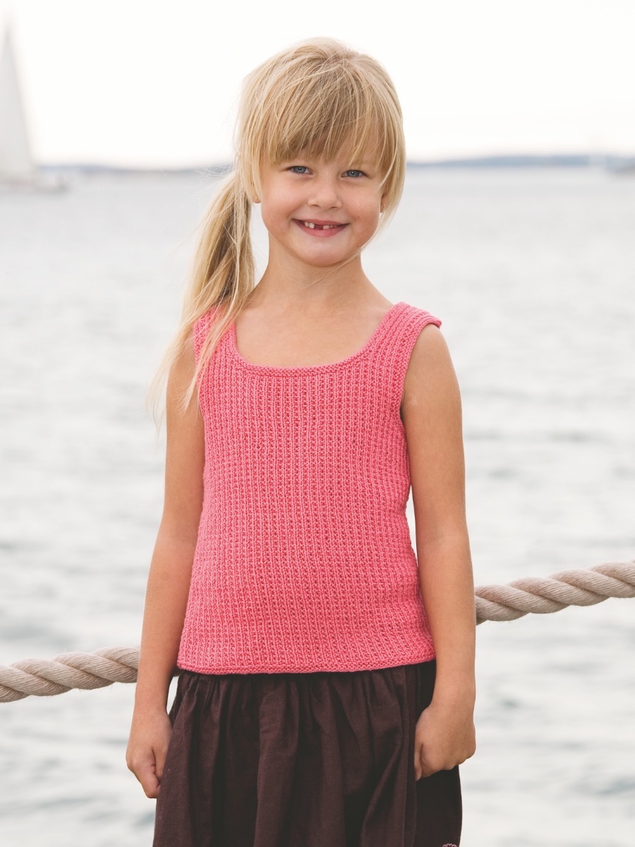 Toppen strikkes i et simpelt strukturmønster, hvor ret- og vrangmasker gentages på hver pind. For- og bagstykket formes ved at lukke masker af til ærmegab og hals, og stykkerne blokeres og sys sammen. Hals- og ærmekanterne samles op og strikkes i retstrik for en ren afslutning.