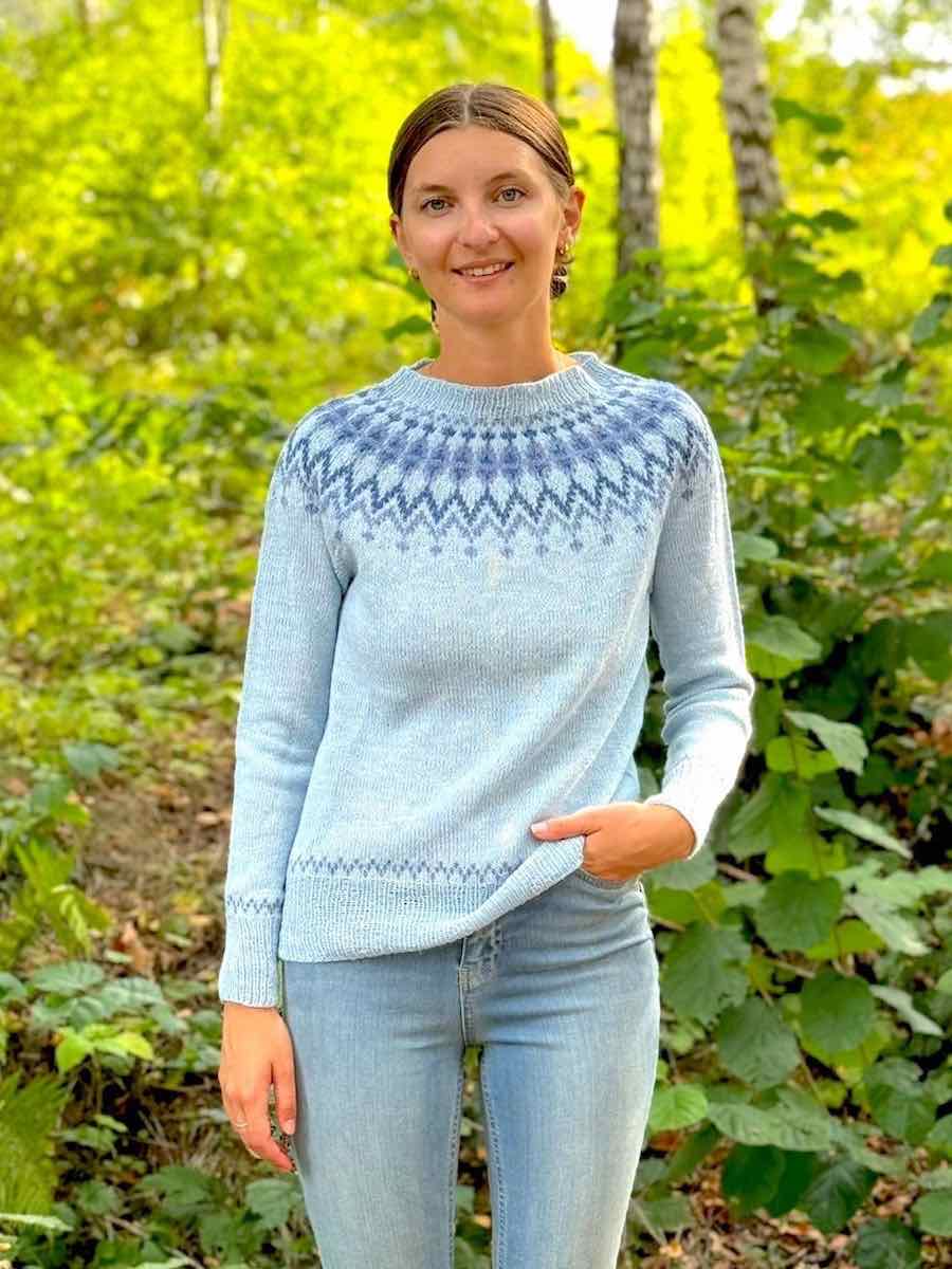 Sweateren strikkes på traditionel vis i fire dele, der samles med et bærestykke, der strikkes rundt.