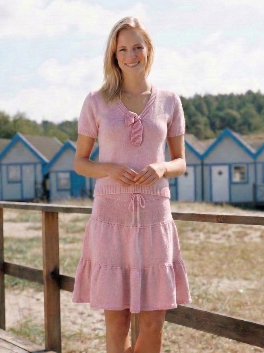 Dette strikkede sæt, bestående af en fin tanktop og en flagrende nederdel , er et strålende eksempel på, hvordan klassisk glatstrikning kan skabe et moderne og tidløst look. Tøjet er strikket i et blødt bomuldsgarn, der giver et dejligt fald og en behagelig følelse mod huden, perfekt til varme sommerdage.