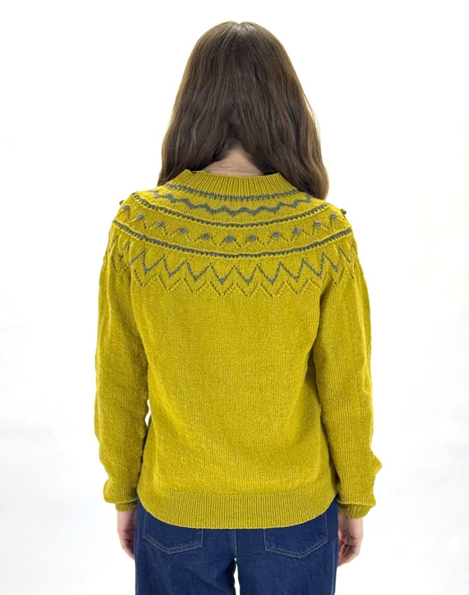 Bæretrøjen strikkes nedefra og op på rundpinde, alle dele samles for at danne bærestykket som strikkes i runden op til halsen.