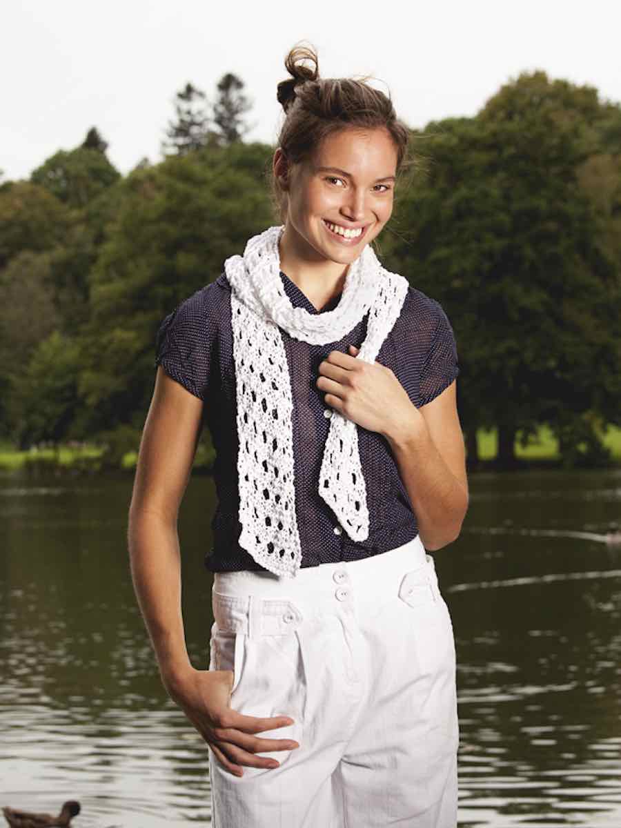 Tørklædet og sjalet. Tørklædet er strikket med hulmønster på grove pinde, hvilket giver et luftigt og elastisk mønster. Sjalet er strikket i et hulmønster med kantmasker og varierede hulrækker, der gentages. Arbejdet afsluttes med retmasker og elastisk aflukning for en blød, formbar kant.