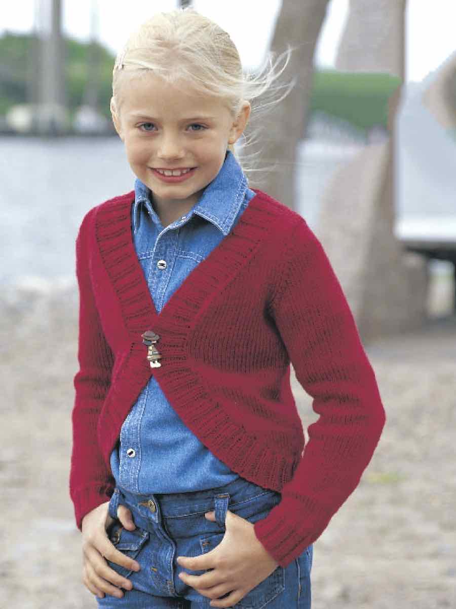 Kort bolero i ribstrik. Strikkes i dele med raglan, ribmønster og lige pasform. Samles ved at sy delene sammen og sy kanter, pyntet med en broche. Ryg- og forstykke strikkes nedefra og op i ribstrik med ud-/indtagninger for at få form og raglan. Ærmerne strikkes separat og sys i. Halsudskæringen samles op med rundpind og strikkes i rib. Lukkes med lynlås (til voksenmodel) eller broche (børnemodel).