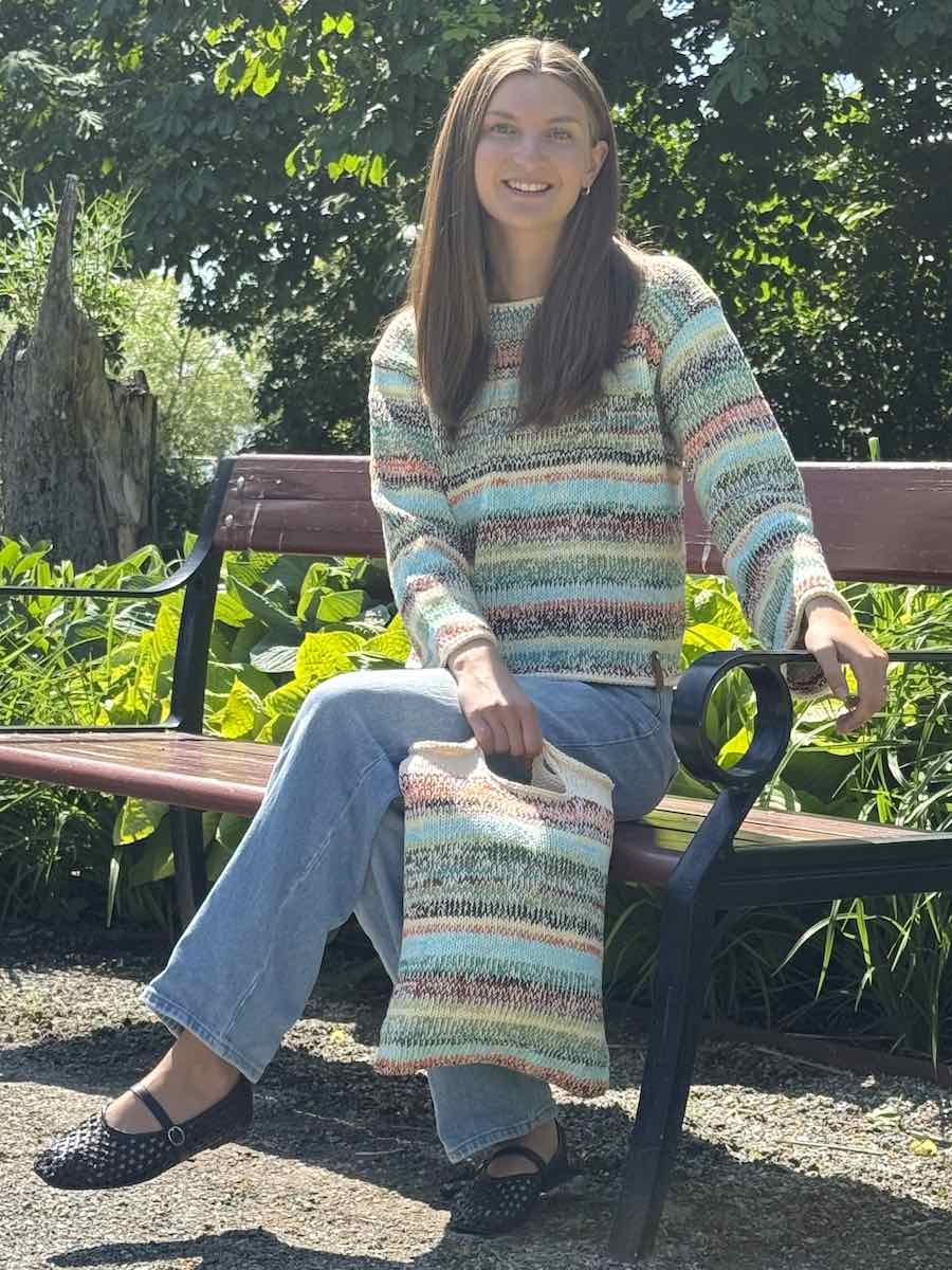 Konfettisweateren er strikket i farverige striber med varierende nuancer. Mønsteret er alsidigt og inkluderer både sweateren og den matchende taske.