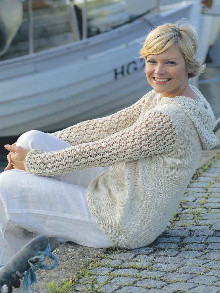 Trøje med blondeærmer og hætte. Kroppen strikkes i glatstrik, ærmer og hætte i hulmønster. Hætten strikkes separat og sys på. Afsluttes med skulder-, ærme- og sidesøm.