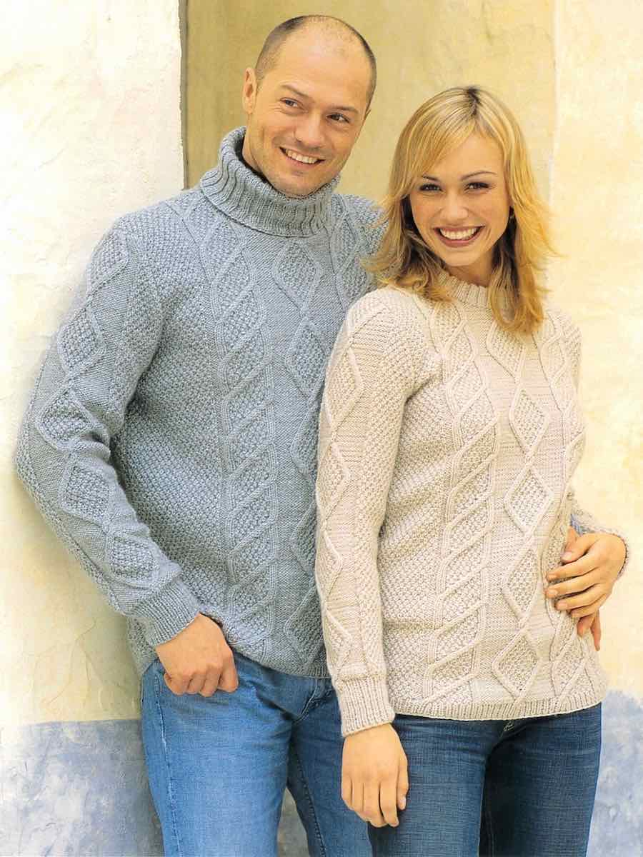 Sweater med rund eller polo hals, begge modeller er strikket på traditionel vis i dele. Trøjerne strikkes i perlestrik og snoninger.