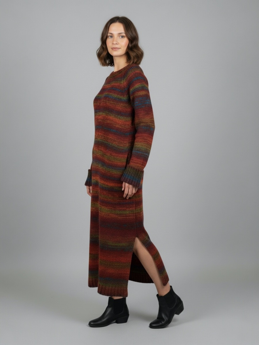 Kjolen strikkes ovenfra og ned i dobbelt garn. Start med rib ved halsen og fortsæt i glatstrik med raglanudtagninger efter markørerne. Del ærmerne til ryg- og forstykke, strik rundt til ønsket længde og afslut med rib og slids. Ærmerne strikkes separat med en foldet kant.
