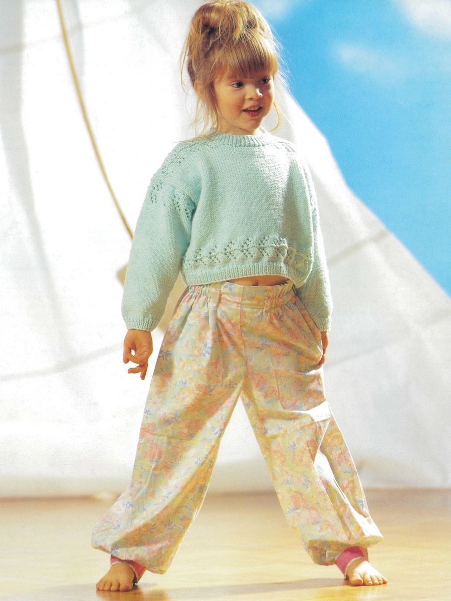 Sweater strikket på traditionel vis i fire dele. Kort model med mønstret kant.