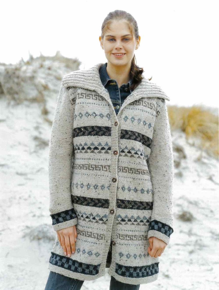 Lang cardigan med stor krave og flerfarvet strikmønster. Den er strikket i dele, der er syet sammen.