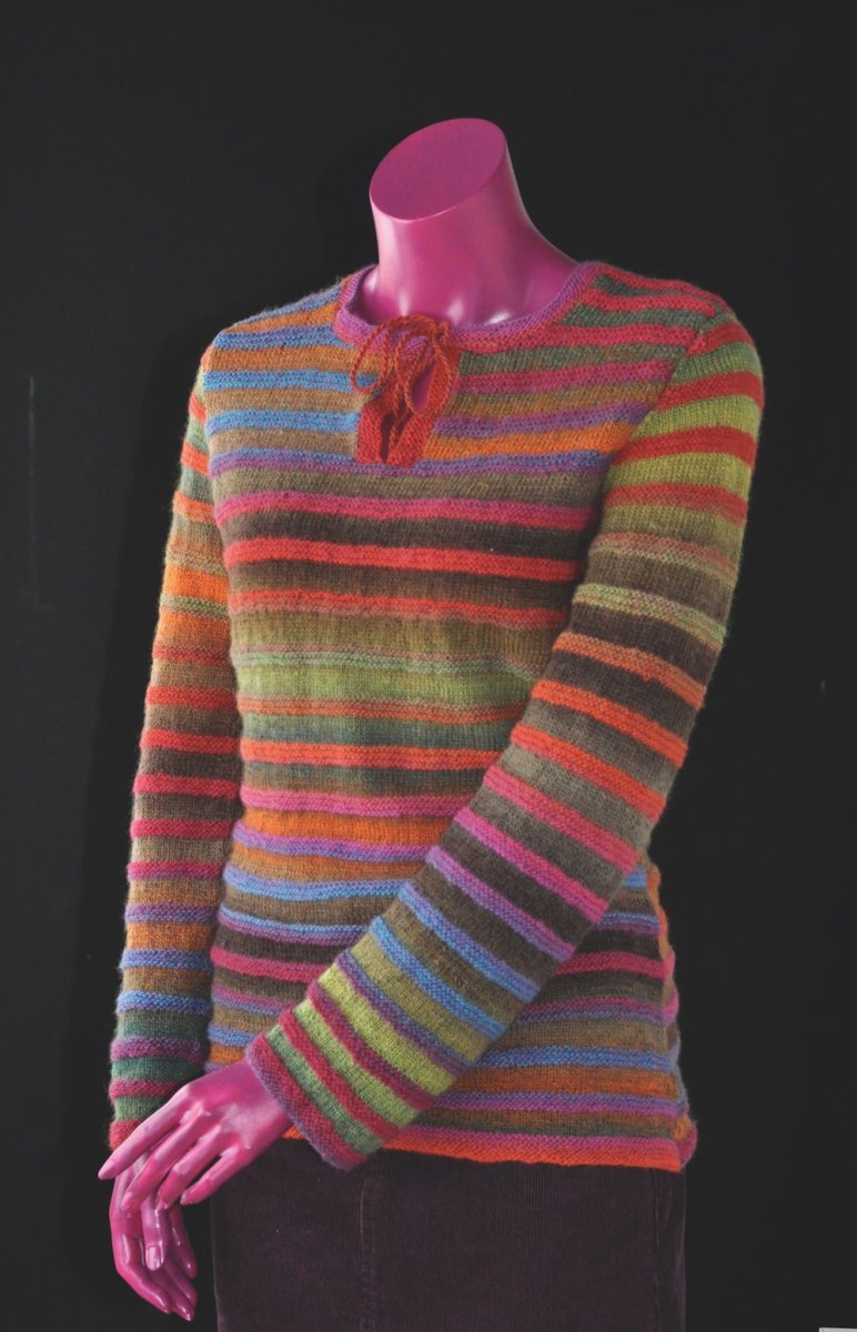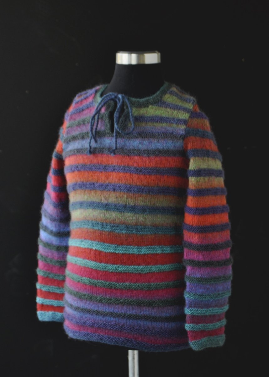 Stribet familietrøje til børn, kvinder og mænd - en tidløs klassiker med slids og bindebånd i halsen. Strikket i dele med ribkanter, glatstrik og syet sammen. Halsudskæringen strikkes separat, og der er snørebånd fastgjort til binding.