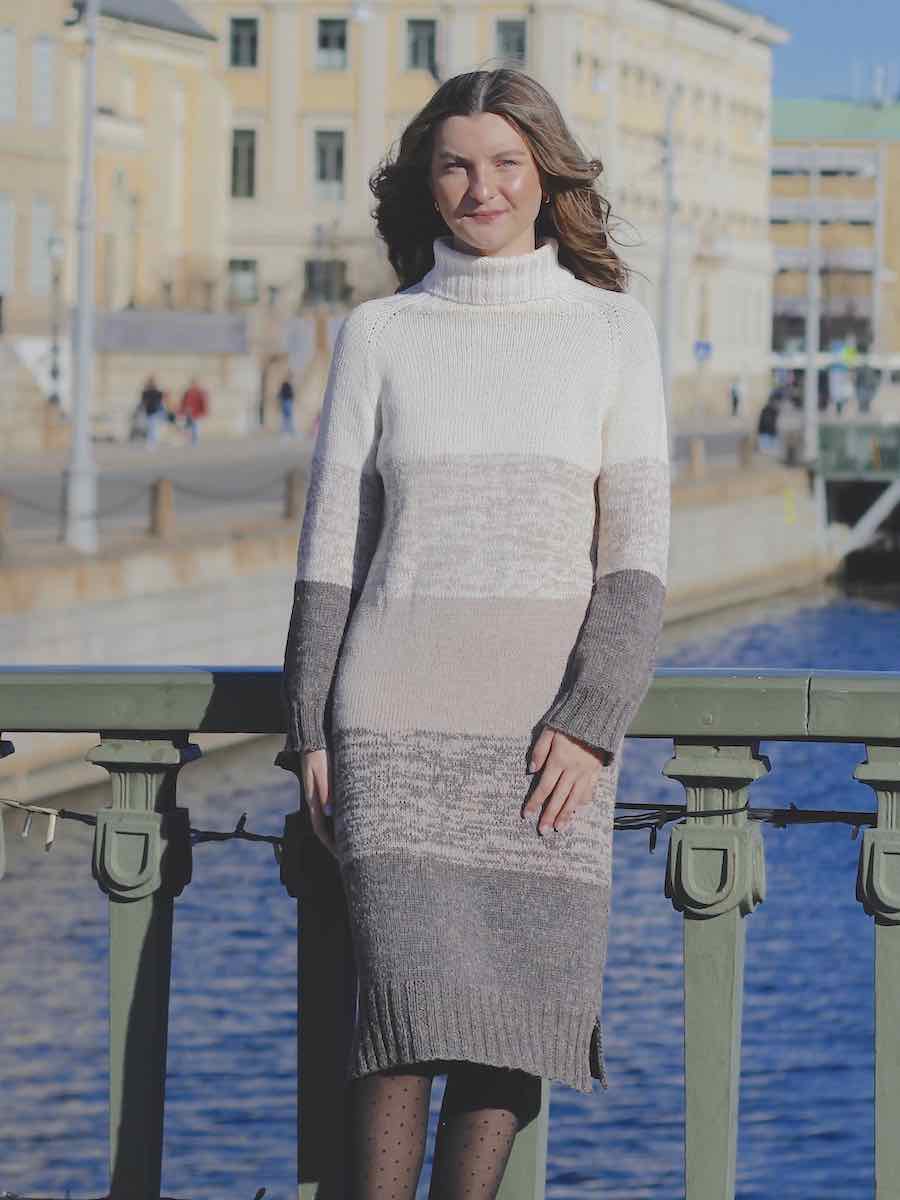 En lang kjole, der er strikket oppefra og ned i dobbelt garn. Kjolens striber laves ved at skifte en tråd ad gangen, på denne måde får du melange.