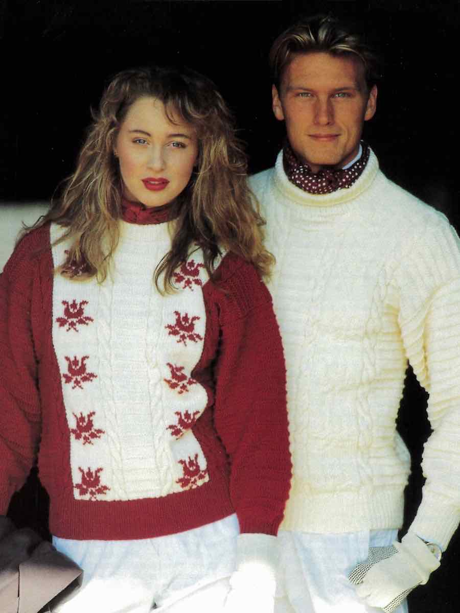 Trøjerne er strikket på traditionel vis. Dametrøjen har strikkede blomster.