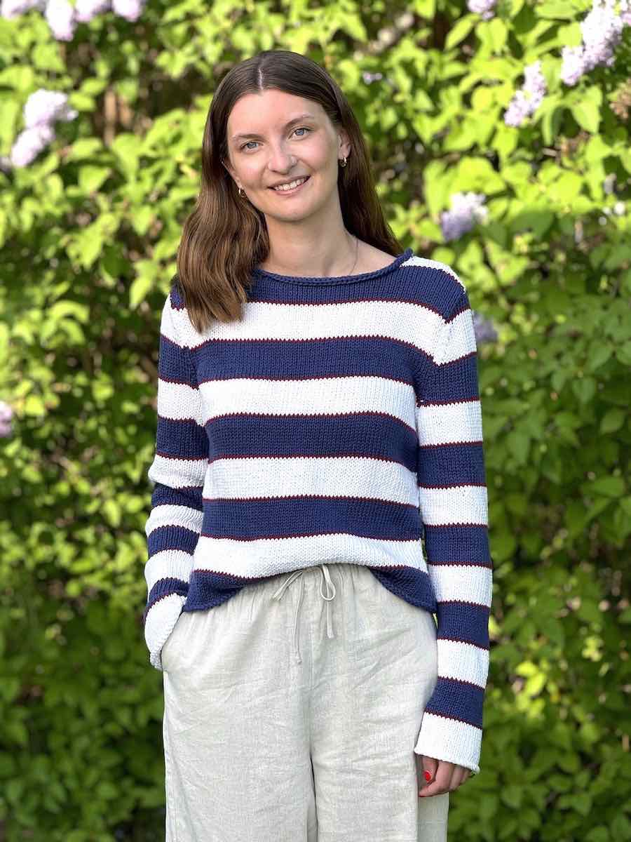 Sweater med striber strikket på traditionel vis i 4 dele. Sweateren er lidt trukket ind i taljen, hvilket gør, at tøjet føles slankere.