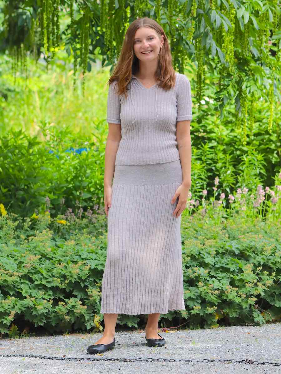 Toppen strikkes rundt til ærmegabene og deles derefter i for- og bagstykker. Nederdelen er strikket oppefra og ned, så du nemt kan justere længden.