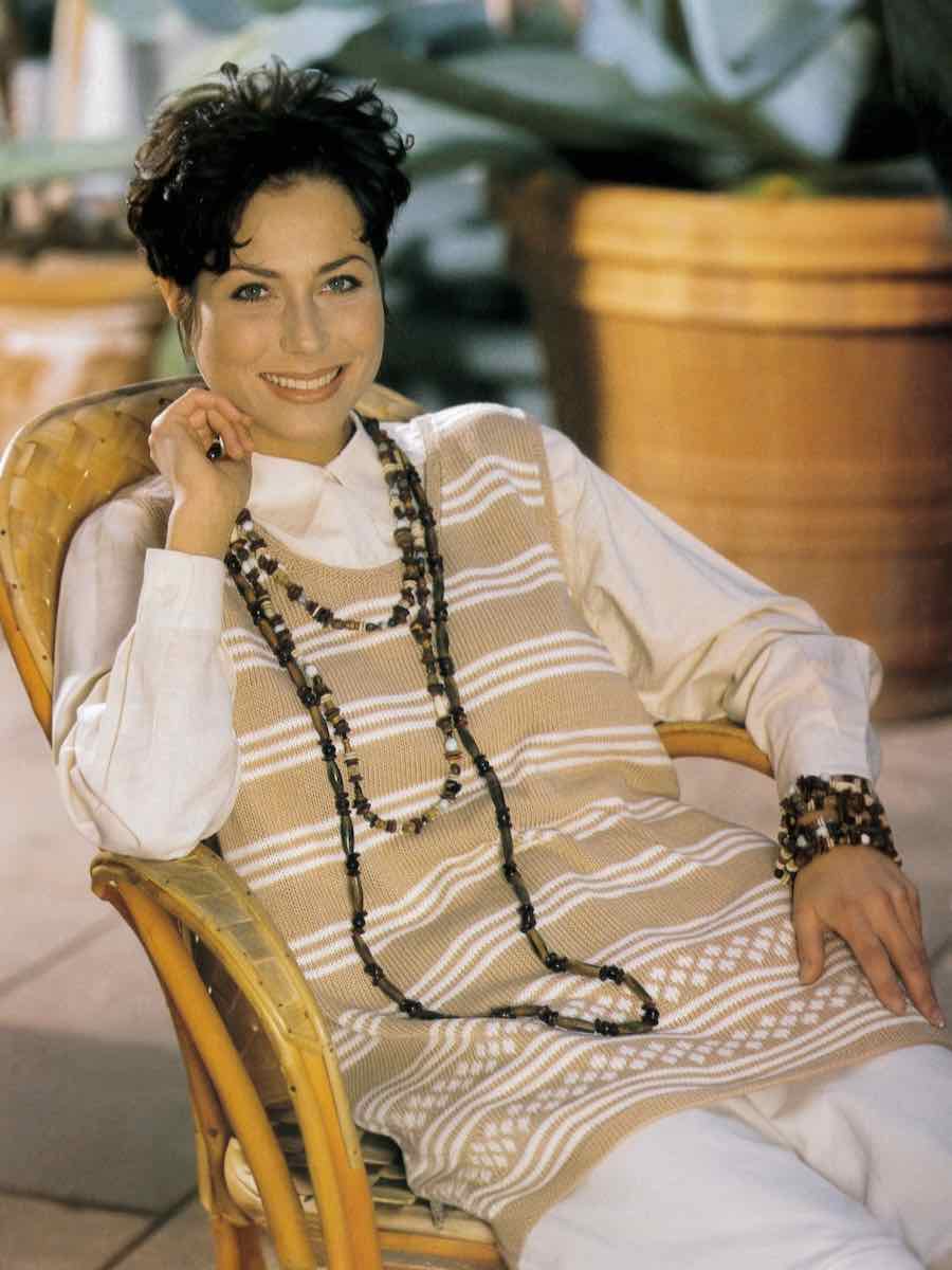 Tunikaen strikkes i stykker med elastik og mønster efter diagrammet. Luk af til hals og ærmegab, sy delene sammen og afslut med hals- og ærmekanter. Sy knapper i henhold til anvisningen.
