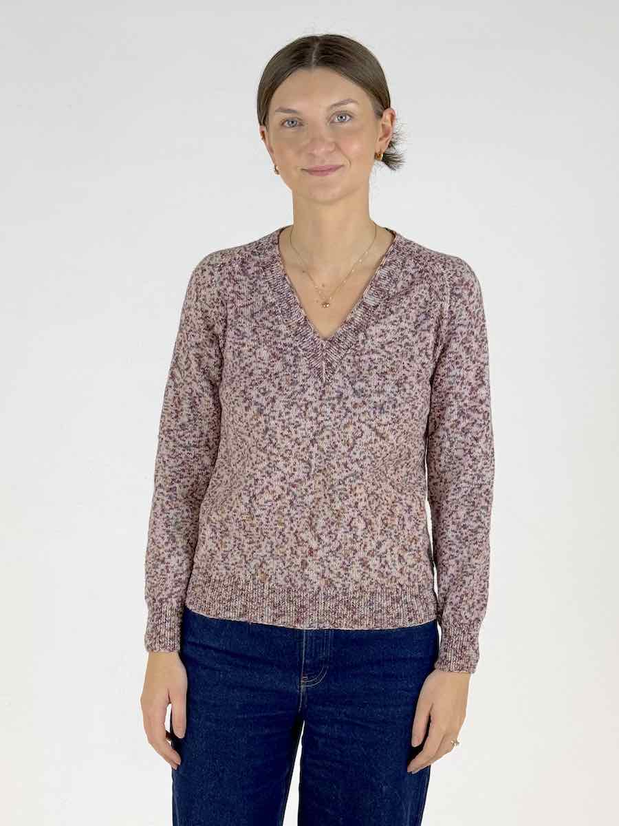 V-hals sweater, der er strikket på traditionel vis med raglanærmer.