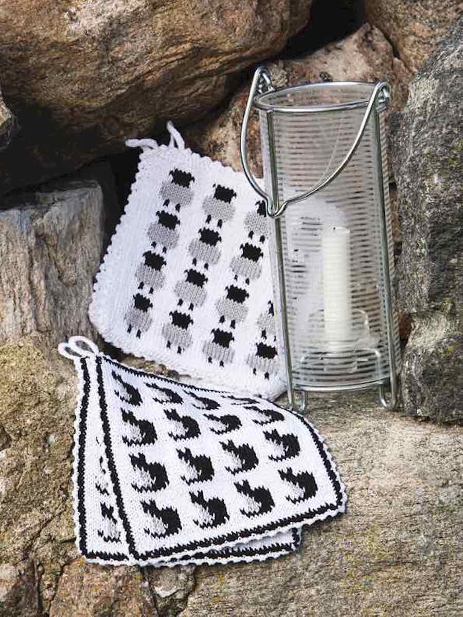 Grydelapper med fåre- eller kattemotiver i merceriseret bomuld. Strik rundt i glatstrik efter diagrammet og afslut med hæklet kant og hank.