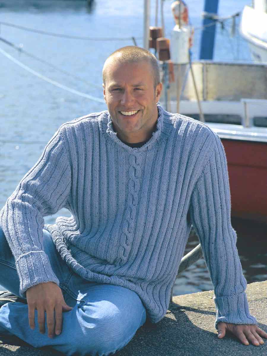 Sweater med sadelærmer og snoninger, strikket i et struktureret mønster med diagrammer. Ærmerne er formet med udtagninger og syet til skuldersømmen. Ribkanten i halsudskæringen strikkes separat.